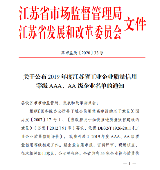 我司榮獲2019年度工業(yè)企業(yè)質(zhì)量信用等級AAA級企業(yè)榮譽