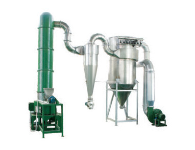 熱空氣切線進(jìn)入閃蒸干燥機(jī)底部,在攪拌器帶動(dòng)下形成強(qiáng)有力的旋轉(zhuǎn)風(fēng)場(chǎng)。膏狀物料由螺旋加料器進(jìn)入干燥器內(nèi),在高速旋轉(zhuǎn)攪拌槳的強(qiáng)烈作用下,物料受撞擊、磨擦及剪切力的作用下得到分散,塊狀物料迅速粉碎,與熱空氣充分接觸、受熱、干燥。脫水后的干物料隨熱氣流上升,分級(jí)環(huán)將大顆粒截留,小顆粒從環(huán)中心排出干燥器外,由旋風(fēng)分離器和除塵器回收,未干透或大塊物料受離心力作用甩向器壁,重新落到底部被粉碎干燥。